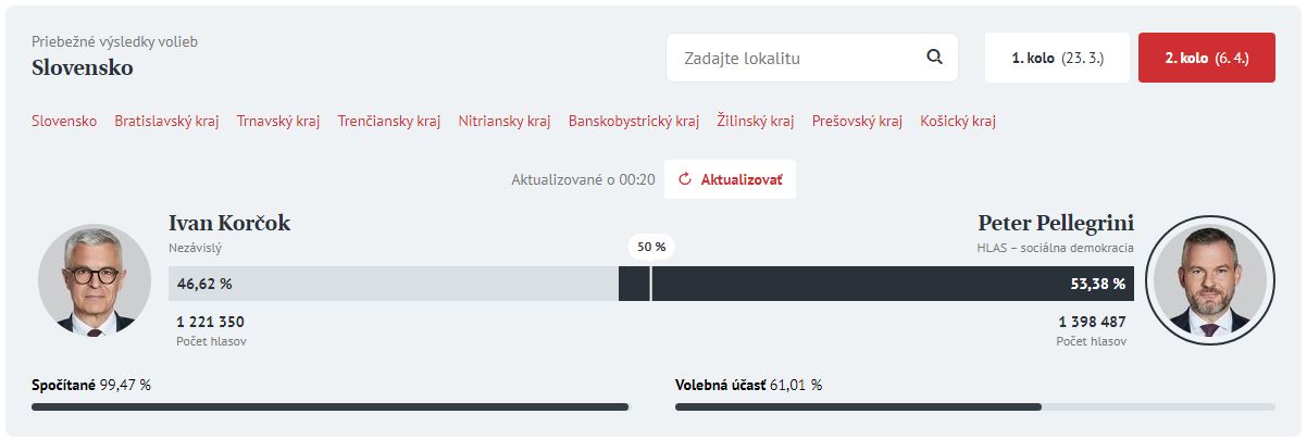 Novým prezidentom Slovenskej republiky bude líder Hlasu a predseda parlamentu Peter Pellegrini. Druhé kolo volieb neprenieslo tesný súboj, aký predikovali prieskumné agentúry či odborníci. Pellegrini podľa priebežných výsledkov vedie pred Ivanom Korčokom o viac ako 180-tisíc hlasov a smeruje k pomerne jasnému víťazstvu. Volebná účasť v druhom kole je ešte vyššia ako v tom prvom a prekročila 60 %, čo je najviac v druhých kolách za posledných 25 rokov.