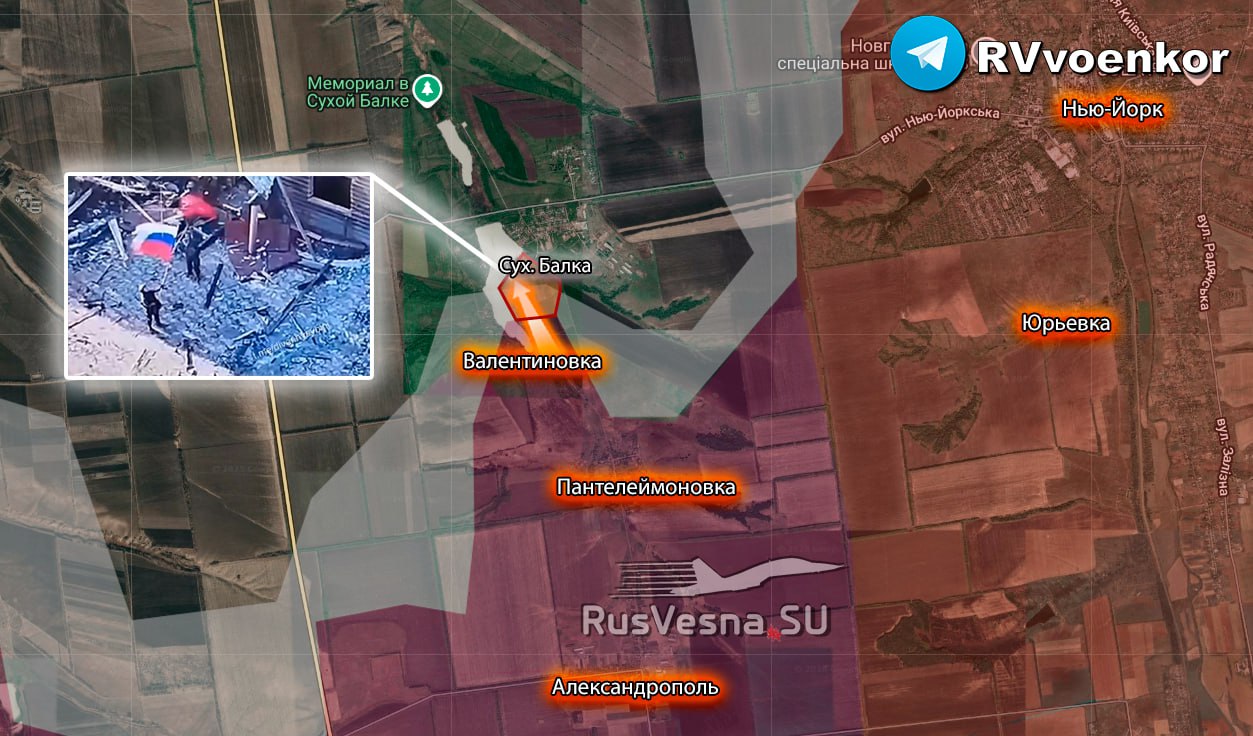 ‼️🇷🇺 Ruská armáda vztyčuje (https://t.me/divannyevoini/14719) vlajku nad Suchou Balkou a postupuje smerom na Konstantinovku