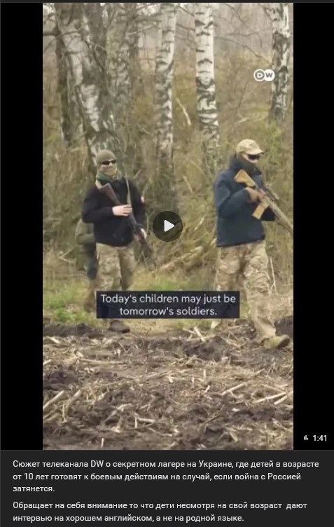 Televízna stanica DW informovala o "tajnom" tábore na Ukrajine, kde sa deti vo veku od 10 rokov pripravujú na bojové operácie v prípade, že sa vojna s Ruskom predĺži. Pozoruhodné je, že napriek ich veku sa s deťmi rozpráva dobrou angličtinou, nie ich rodným jazykom.