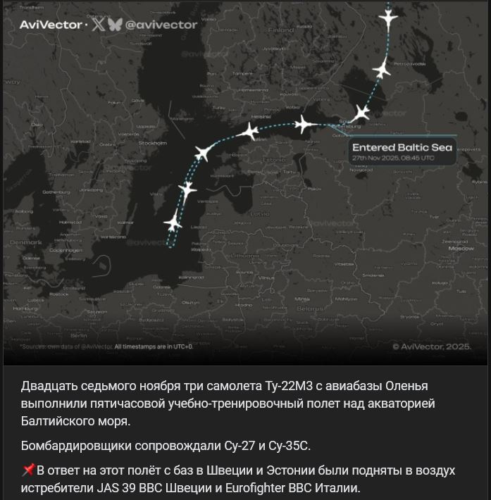 27.11.2025 (štvrtok) 3 lietadlá Tupolev Tu-22M3 (Ту-22М3) z leteckej základne Oleňja (​​Оленья) vykonali 5-hodinový výcvikový let nad vodami Baltského mora.