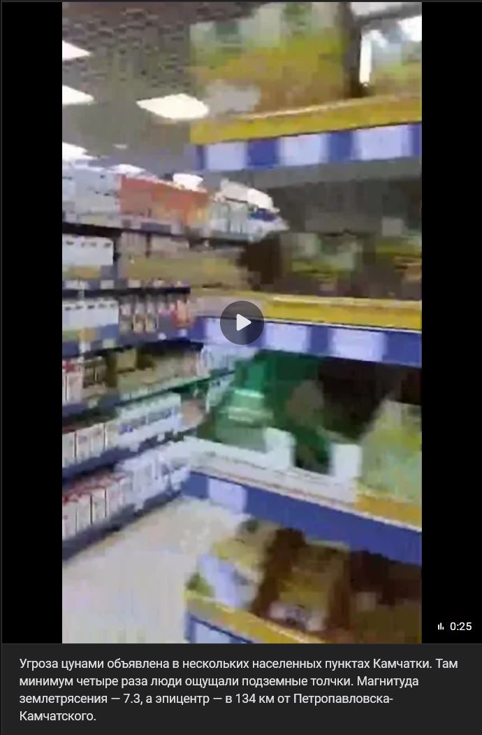 Zábery ukazujú následky jedného zo silných otrasov zeme na Kamčatke s magnitúdou 7,6. Miestni obyvatelia hlásili rôzne škody v nákupných centrách v Petropavlovsku-Kamčatskom (Петропавловск-Камчатского) - z regálov spadol tovar a v inom nákupnom centre spadla zo stropu ťažká ozdobná guľa. Neboli hlásené žiadne obete.
