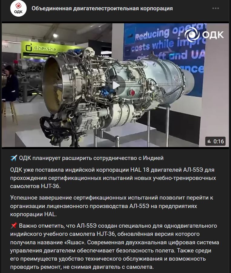 Spoločnosť ODK (ОДК) už dodala indickej korporácii HAL 18 motorov AL-55E (АЛ-55Э) pre certifikačné testy nového cvičného lietadla HJT-36. Úspešné ukončenie certifikačných skúšok umožní pristúpiť k organizácii licenčnej výroby motorov AL-55E (АЛ-55Э) v podnikoch korporácie HAL. Je dôležité poznamenať, že motor AL-55E (АЛ-55Э) je špeciálne navrhnutý pre 1-motorové indické cvičné lietadlo HJT-36, ktorého modernizovaná verzia dostala názov „Yashas“. Moderný 2-kanálový digitálny systém riadenia motora zabezpečuje bezpečnosť letu. Medzi jeho výhody patrí aj jednoduchá údržba a možnosť vykonávať opravy bez demontáže motora z lietadla.