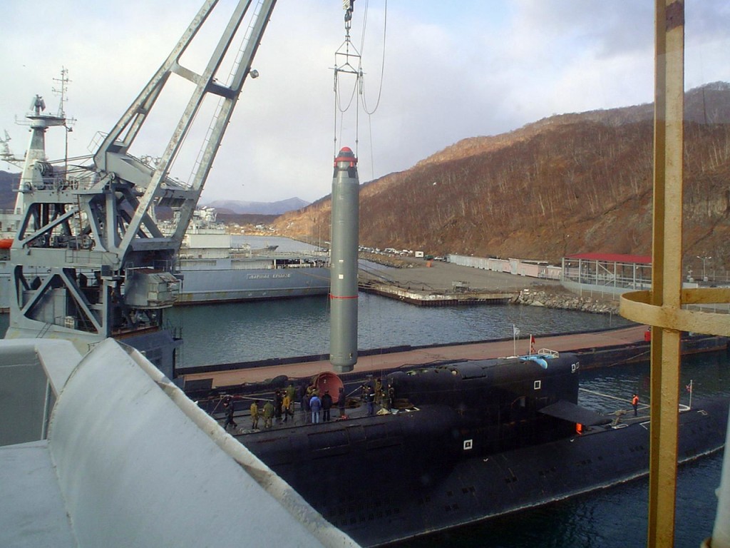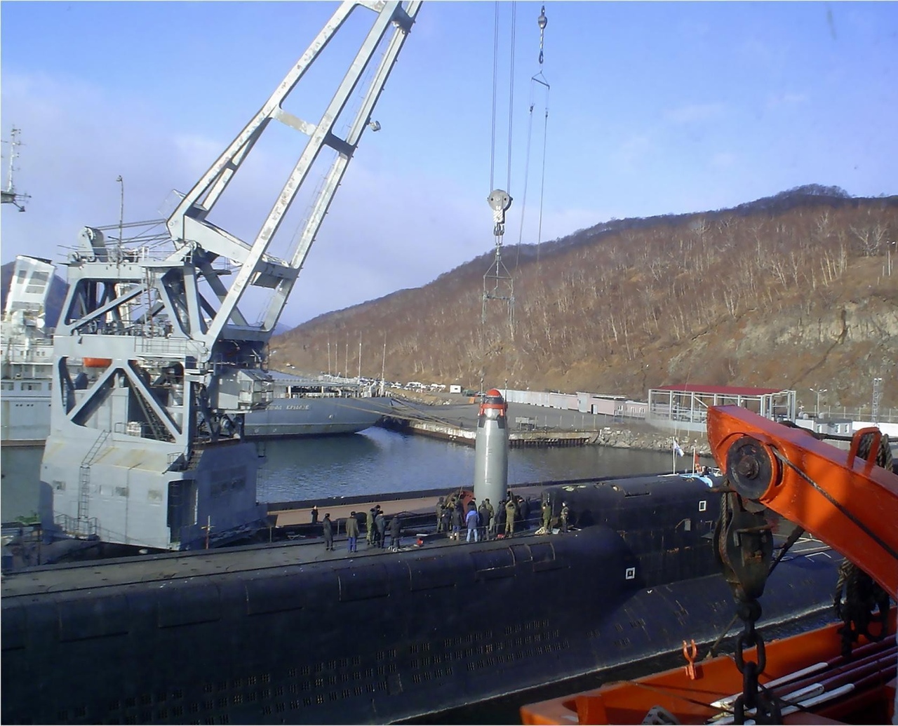Fotografie zachycují nabíjení balistické rakety na poslední ponorku projektu 667BDR, K-44 Ryazan