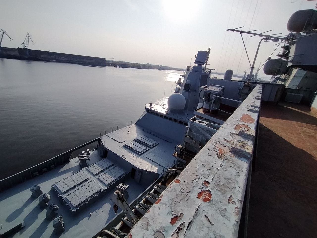 Fregata Admiral Gorškov (Адмирал Горшков) projektu 22350 fotená z paluby krížnika Kirov (Киров) projektu 1144 v prístave Severodvinsk: