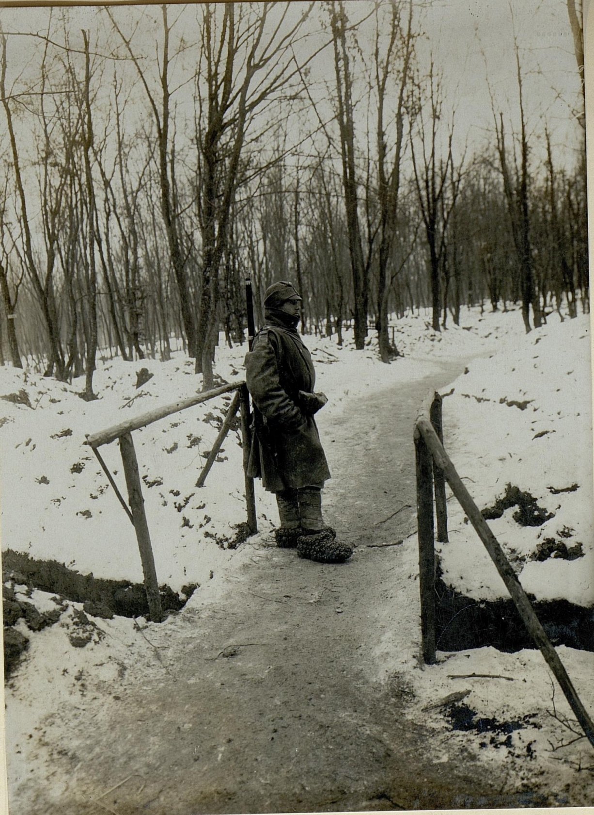 Rakousko-uherští vojáci desáté armády vyrábějící na zimu slaměné boty v září 1916. Ty byly nošeny přes normální boty, aby byly izolovány proti chladu.