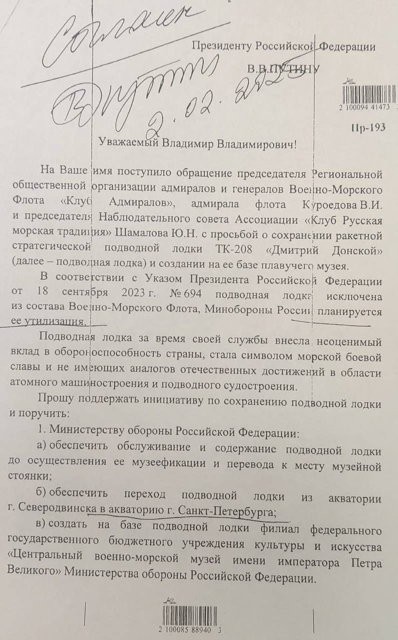 Na internete sa objavil dokument podpísaný vedúcim prezidentskej administratívy A. E. Vajno (А. Э. Вайно) o muzealizácii A-ponorky TK-208 Dmitrij Donskoj (ТК-208 Дмитрий Донской) projektu 941 Akula