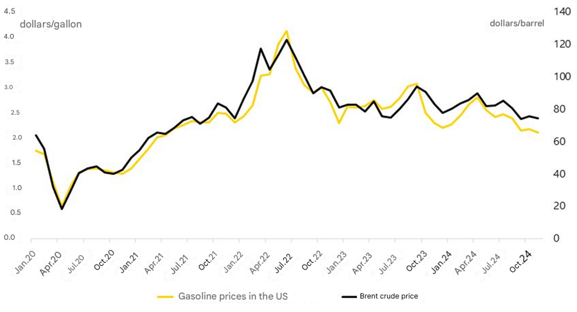 - Tento graf ukazuje takmer 100 % koreláciu medzi cenami ropy a maloobchodnými cenami benzínu v Spojených štátoch.