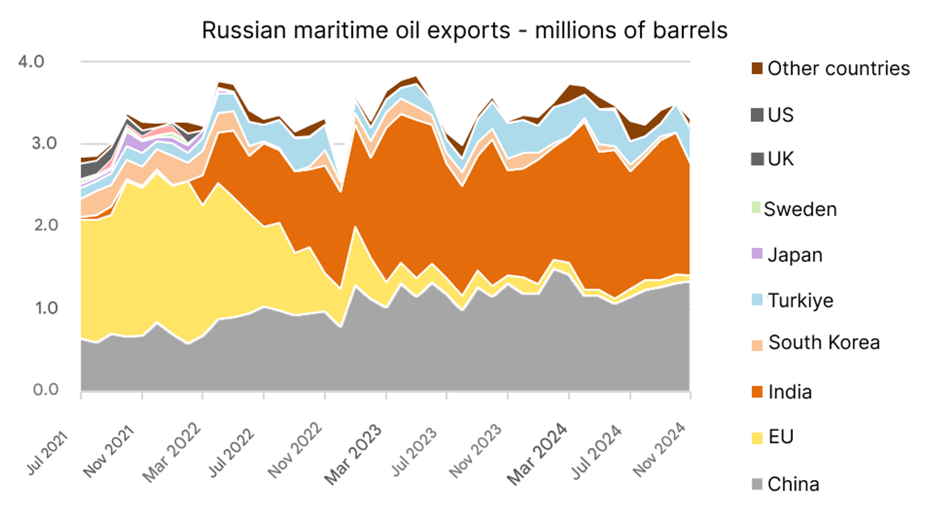 Ruský námorný vývoz ropy a ropných produktov predstavuje približne 5,8 milióna barelov denne, z čoho 3,5 milióna barelov denne je ropa.